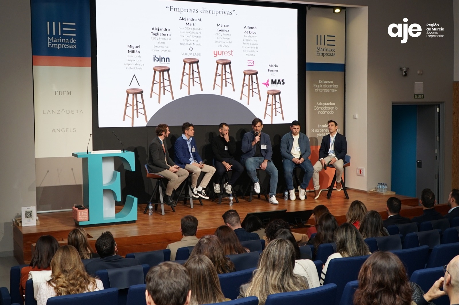 A continuación, se realizó una segunda mesa- coloquio “Empresas Disruptivas” en las que participaron los premiados en las distintas AJES, Alejandro Tagliaferro (CEO y PPC Manager de IBINN Group y Premio al Talento Empresarial Joven Jovempa), Alejandro M. Martí (Co – CEO en Votum World y Ganador Premio Caixabank “Héroes” Jóvenes Empresarios Región de Murcia, Marcos Gómez (CEO de Yurest Solutions y premio AJEV Joven empresario del año 2025), Alfonso de Dios Velázquez (Fundador y propietario de Vibra Burguer y Premio Joven Empresario de AJE Castilla La Mancha y Mario Forner (CEO de MA´s Events). Esta mesa fue moderada por Miguel Milián, Responsable de metodología de Lanzadera.
