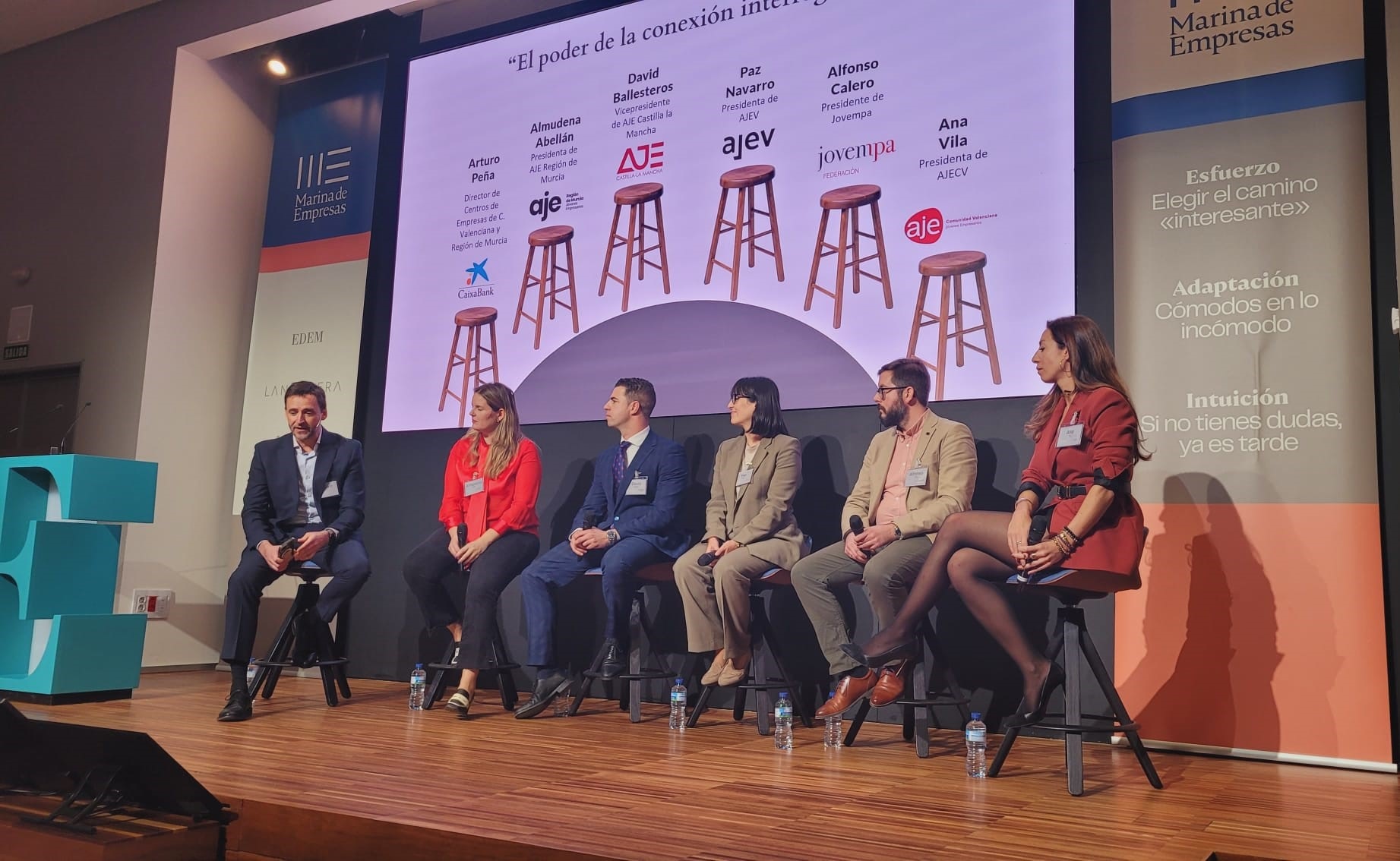 Javier Cerverón, Director de Desarrollo de Negocio de EDEM, dio la bienvenida, dando paso a la primera mesa “El poder de la conexión interregional” en la que participaron los representantes de cada una de las AJES, Almudena Abellán, Presidenta de AJE Región de Murcia, David Ballesteros, Vicepresidente de AJE Castilla la Mancha, Alfonso Calero, Presidente de Jovempa Federación, Paz Navarro, Presidenta de AJEV y Ana Vila, Presidenta de AJECV.  La mesa estuvo moderada por Arturo Peña, Director de Centros de Empresas de la Territorial de la Comunidad Valenciana y Región de Murcia de Caixabank.