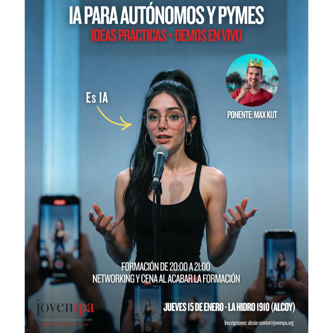 Desde Jovempa Alcoià Comta i Foia te traemos para empezar el año esta formación de IA para autónomos y pymes con ideas prácticas accionables, demostraciones en vivo y resolución de dudas, a cargo de Max Kut